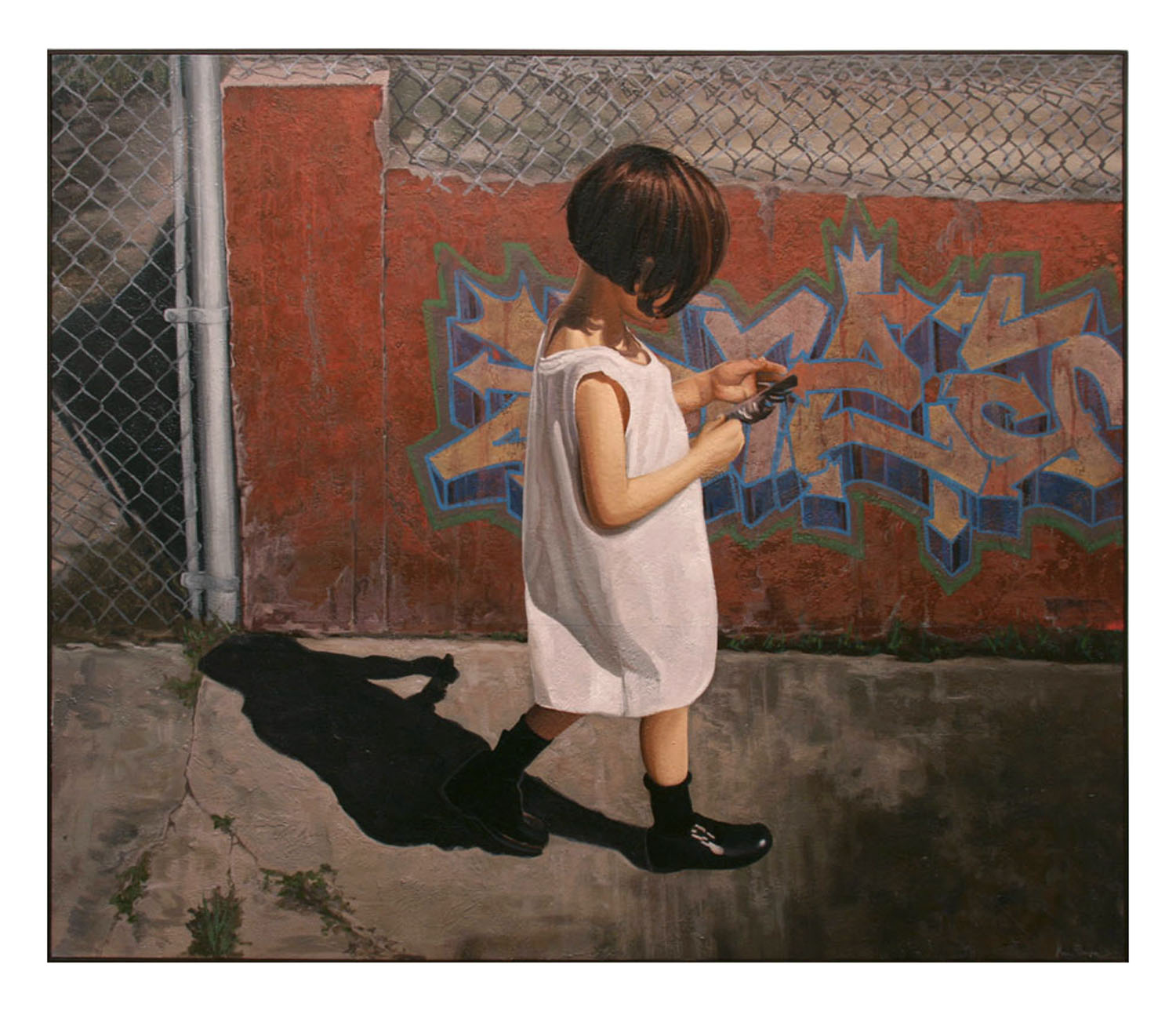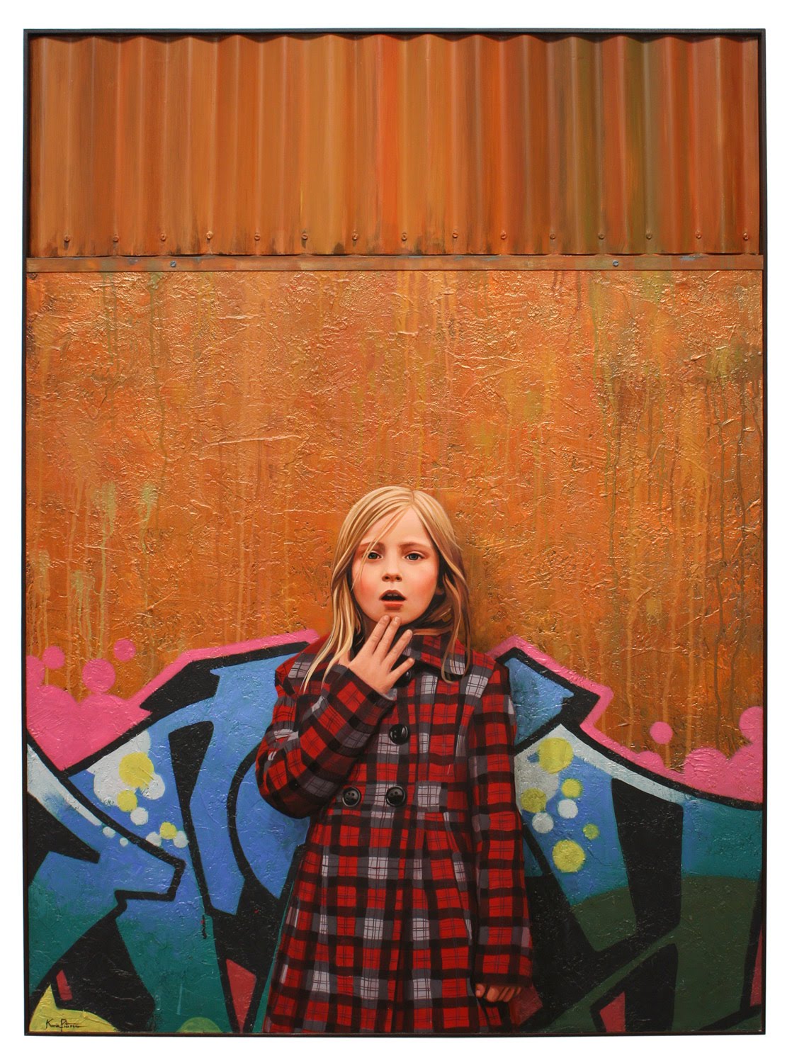 I fell in love with Kevin Peterson’s work the moment I saw the juxtaposition of innocent children in a graffiti filled playground. They are as at home as they would be running across lush green fields. He captures their expressions with his talent for realism. From the texture of the walls that colorful writing is drawn to the strands of hair that fall down the child’s face; Kevin draws you in and dares you to see if it’s a painting or photograph.