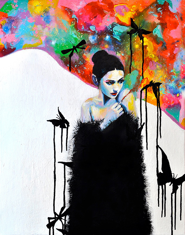 Cathrine Brooks paints beauty suspended in a world of ribbon, nature, bubbles and pearls. Capturing the essence of femininity, it’s power and elegance. Her creativity transcends the canvas as she sometimes pushes her worlds onto laser cut wood and books with bottles. With an electric personality the work equally vibrates with life. Using light to highlight and illuminate her subjects, she creates romance and mystery, a dreamland where our imaginations can wander.